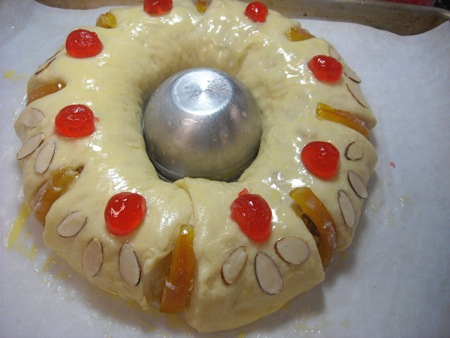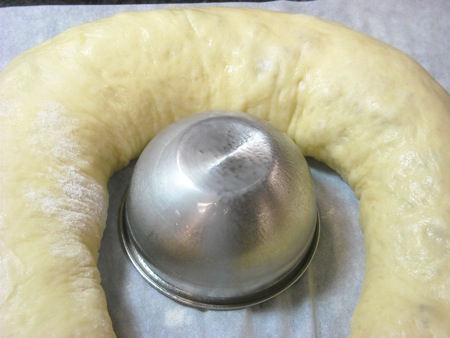 The Rosca is supposed to represent the crown of the king, so the idea is to bake it round. I have a hint to help you make a nice-looking circle. I take a small metal bowl (a ramekin or custard cup will work for this; so would a clean tuna can) and grease the outside. Place that in the center of the parchment, and place the rolled dough around it. This will help the bread keep a nice, neat circle inside as it rises and bakes.