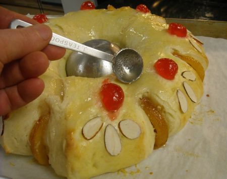 In Spain, there’s both a trinket and a bean. The finder of the doll is crowned and becomes the king or queen of the banquet. Whoever gets the bean has to pay for next year’s Rosca.
