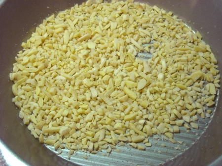 You could pop 'em in the food processor, but I never pass up a chance to give my chef's knife some exercise (also less to wash after). Next step, to toast them lightly. To do that I'll put them in a pie plate (a baking sheet is fine, too. You just want something shallow.)