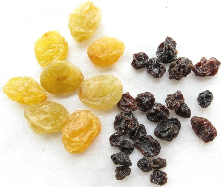 These tiny dried grapes (pictured at right, above, next to golden raisins, for scale) will disperse nicely throughout your cakes. If you want to substitute raisins, it's best to chop them up before use.