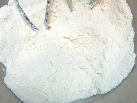 Work it in until the mixture is fairly evenly crumbly; a few larger pieces of butter can remain.