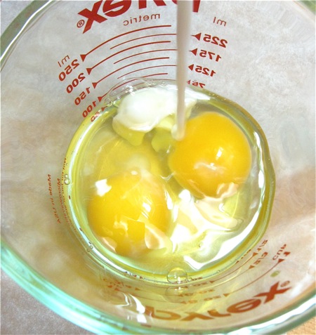 Put 2 large eggs in a measuring cup. Add enough milk to measure 3/4 cup liquid total.