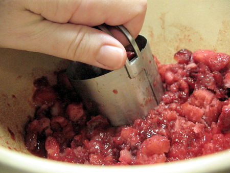 Using a pastry blender, potato masher or, in this case, a biscuit cutter, cut and mash the berries into small pieces. It's really up to you how large you leave the pieces of berry. If you like a chunkier jam, leave them bigger.