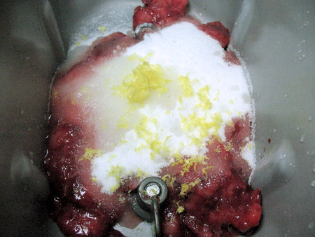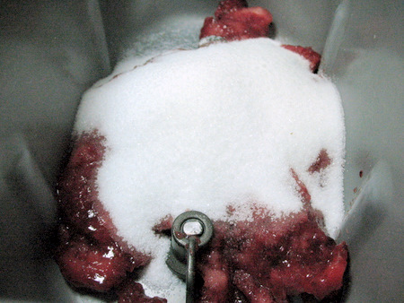Transfer the berries to the pan of your bread machine. Add 3/4 cup (149g) sugar.