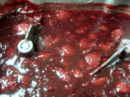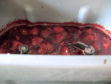 The jam cycle on my Zo is 1 hour, 20 minutes. About 30 minutes into the cycle, I took a peek. You can see that the level of the fruit and liquid has already gone down.