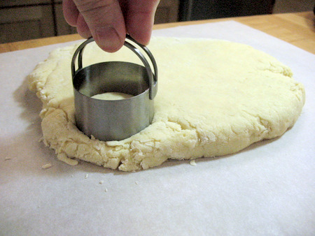 Gently pat the dough into a rough oval, about 3/4” thick. Use your biscuit cutter to stamp out several rounds.