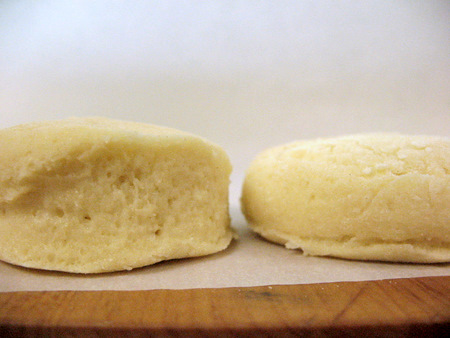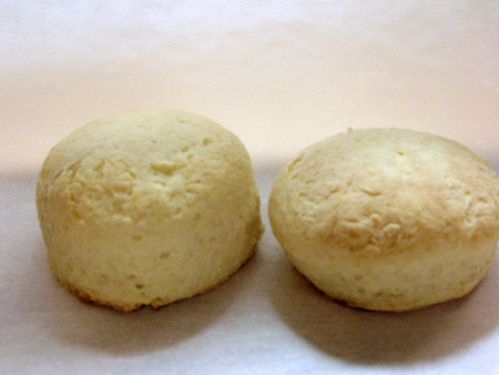 Here are our two test biscuits. The biscuit cutter scone on the left is a full 1/4” higher than the glass scone on the right. Score a point for using biscuit cutters.