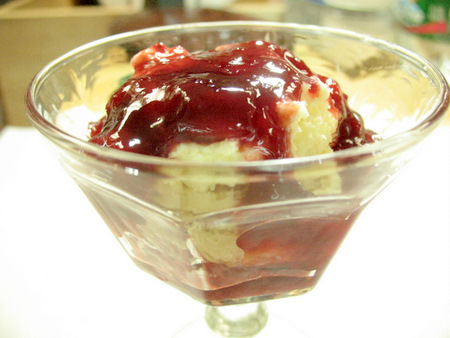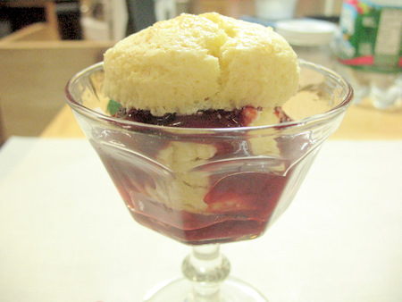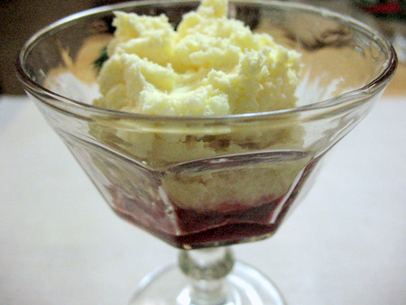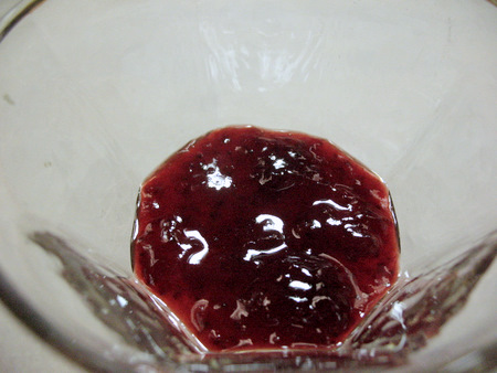 First, a good sized spoonful of jam in the bottom of the glass.