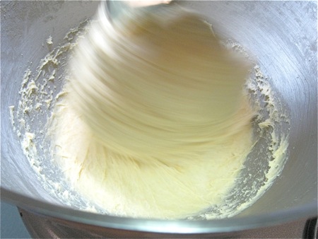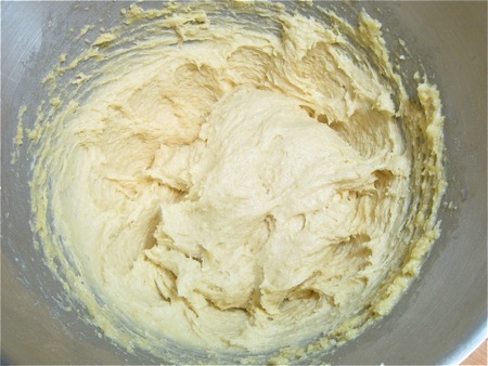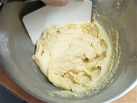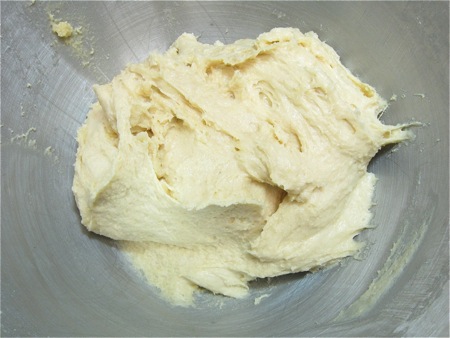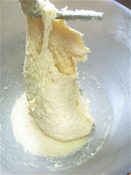 Now, though you'd usually switch to the dough hook at this point, stay with the flat beater. Beat at one speed above your mixer's suggested kneading speed for 5 minutes. The dough will start to smooth out.