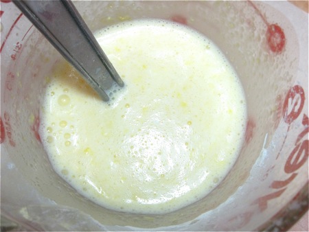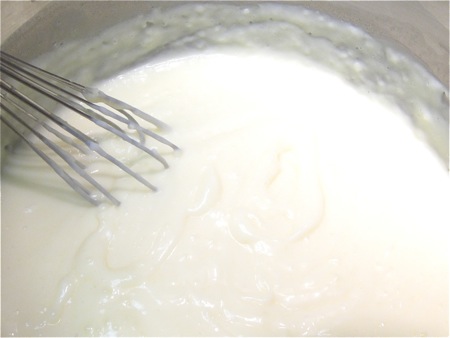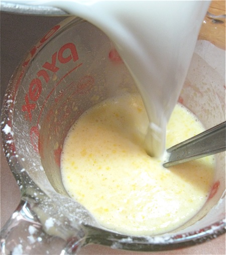 Whisk about 1/3 cup of the hot milk mixture into the egg yolk mixture. This “tempers” the yolks, preventing them from becoming scrambled eggs when you add them to pan of the simmering milk.