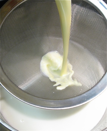Pour the egg/milk mixture back into the pan of simmering milk on the stovetop. Doing this through a strainer will help prevent lumps later.