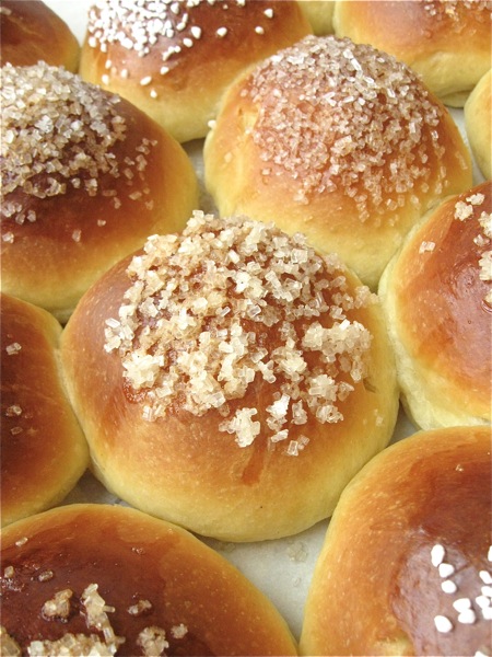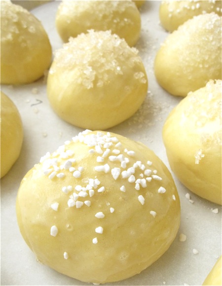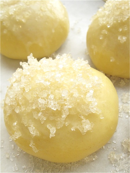 Sprinkle with coarse sparkling white sugar or bright white pearl sugar (pictured above).