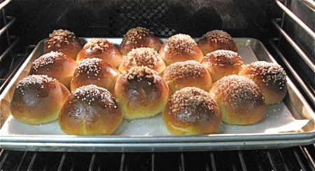 Place the pan on a lower-middle rack in the oven, and bake the brioche for 25 to 30 minutes, tenting them with aluminum foil after 15 minutes if they appear to be browning too quickly.