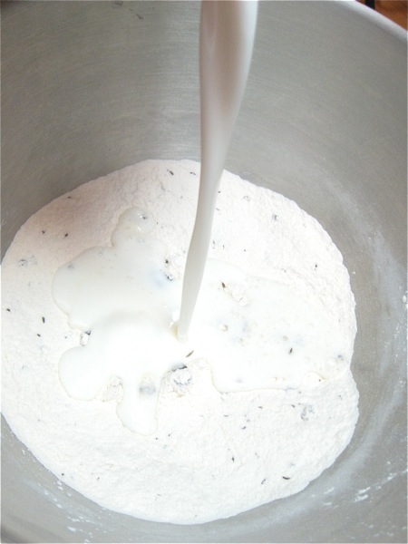 Note how the milk is pooling around the edges of the pan. Next time, I'd take a spoon or my finger and make a little moat right around the edge of the batter, to force the milk more towards the center. You'll see why later.