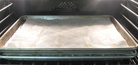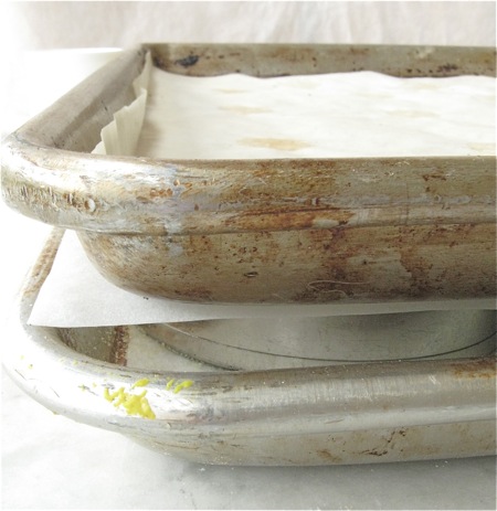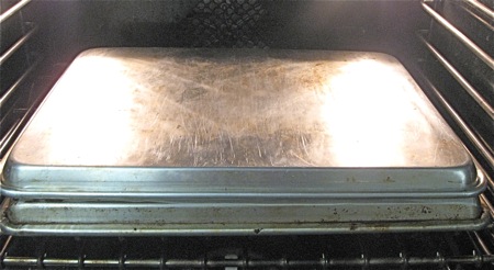 Top with a greased baking sheet (or a sheet of parchment, then the baking sheet). The baking sheet should be resting atop the rings.