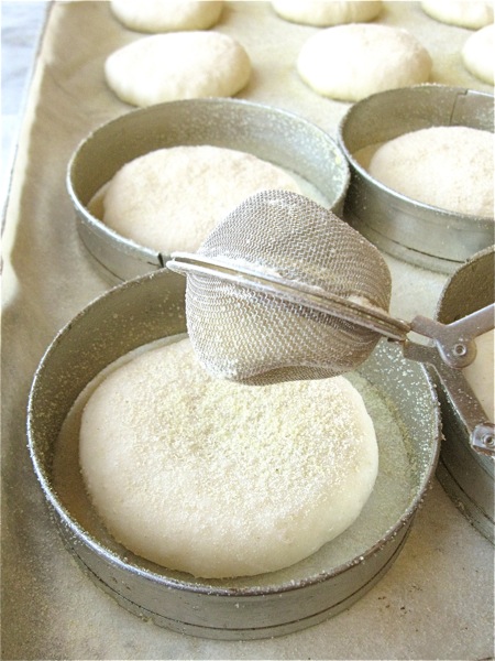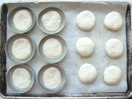 Grease a large (18" x 13") baking sheet; or line with parchment. Grease twelve 3 ¾" English muffin rings, and place them on the baking sheet. Sprinkle semolina or cornmeal into each ring.
