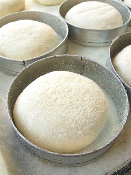 Shape the dough into balls. Place each ball into a ring, pressing it down to flatten somewhat.