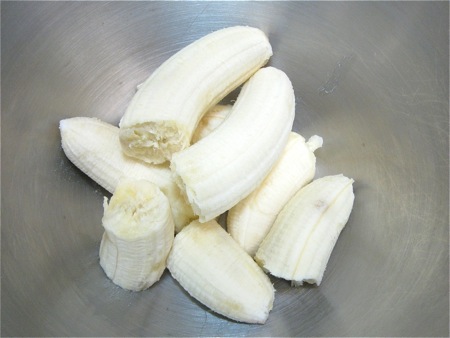 Let's start with the bananas. We're looking for 3 1/2 cups (454g) of mashed bananas for this recipe, but how would you know how many bananas that is, until you mash them?