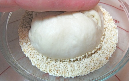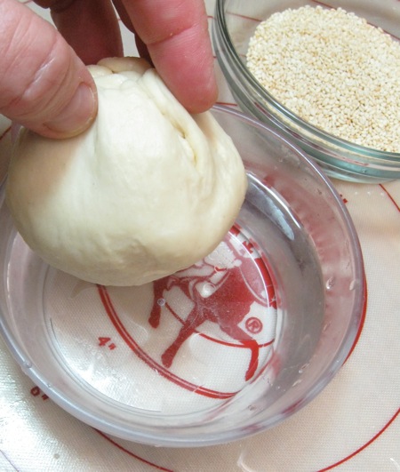 ...then into the seeds of your choice. I'm using sesame seeds here; poppy seeds are equally pretty/tasty.