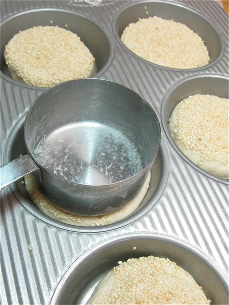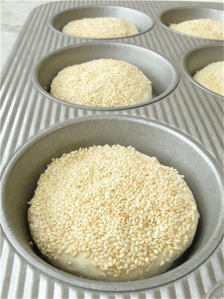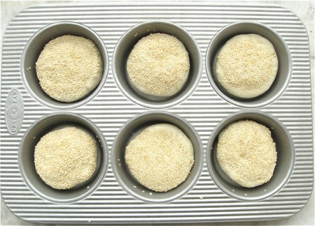 Grease the wells of a hamburger bun pan, or lightly grease a baking sheet, or line with parchment.