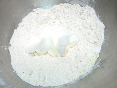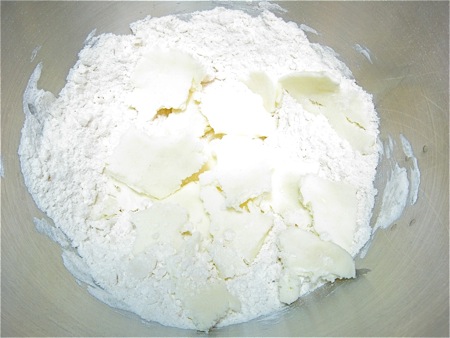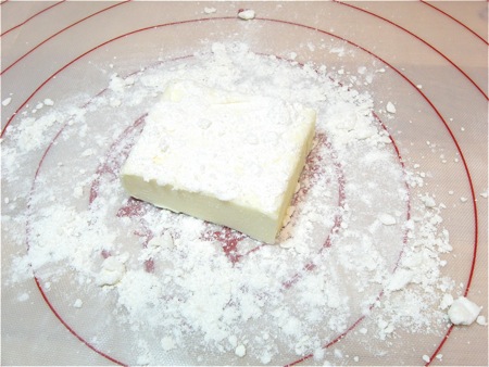 Place the reserved flour mixture on a clean work surface. Add 4 tablespoons (57g) cold butter, and coat it in the flour.