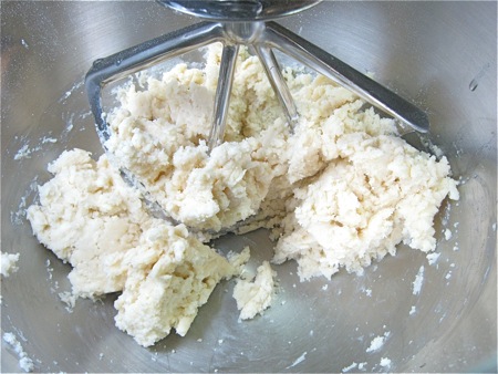 Just as soon as the dough becomes cohesive (i.e., you can squeeze it into a ball easily), stop mixing; there should still be visible pieces of fat in the dough.