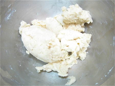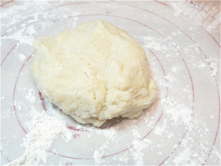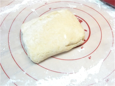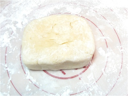 Flatten the dough into a disk and wrap it in plastic wrap. Refrigerate for 30 minutes or longer; this resting period allows the flour to absorb the water and the gluten to relax, making the dough easier to roll out.