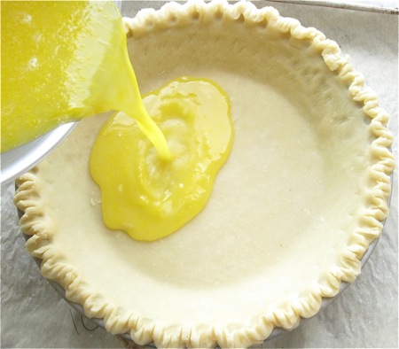 Pour the filling into the chilled pie shell.