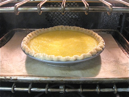 You can just barely begin to see the pie's interesting texture in this photo; imagine a very moist cheesecake... Its flavor, though, is far from cheesecake-y; it's untempered, unabashed lemon, perfect for all your lemon-loving friends and colleagues.