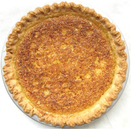 Chess pie? No one seems certain where the name for this pie comes from. A simple combination of eggs, sugar, and butter, with the tiniest bit of flour or cornmeal for thickening, chess pies appeared in print as early as the late 19th century.