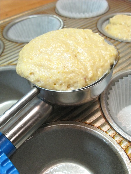 Scoop the batter by the heaping 1/4-cupful into the prepared pan. A muffin scoop is helpful here - no drips, no sticky fingers, and perfect portions every time.