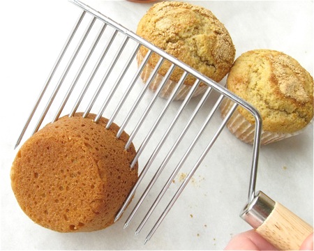 And here's another trick. Hot muffins, like angel food cake or English muffins, can be quite delicate, their interior easily squashed.