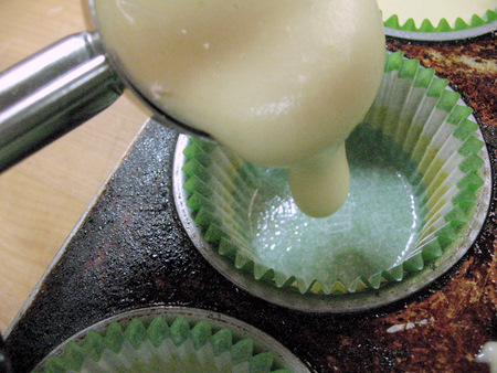 Scoop the batter into the prepared pan. Fill each cup about 2/3 full.