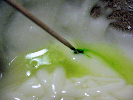 As you stir and adjust the consistency of the glaze, you can add a touch of yellow or green food coloring, if desired.