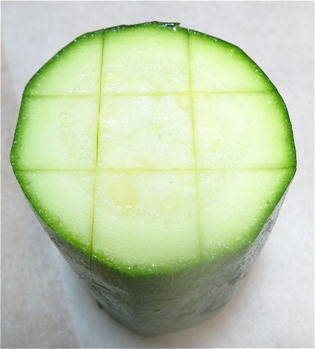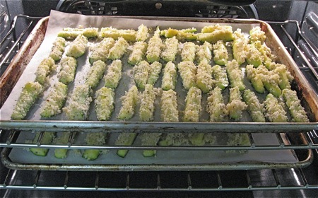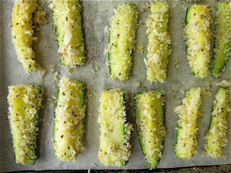 Cut each zucchini into 3" sticks about the diameter of your finger. Cutting each zuke into 9 sticks lengthwise, then cutting into 3" lengths, works well.