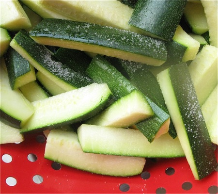 Place the zucchini sticks in a colander over a bowl, and sprinkle with 1 tablespoon of salt. Let them drain for 1 hour or longer.