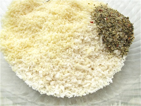 Next up: the bread and cheese coating. But first, preheat the oven to 425°F. Line a baking sheet with parchment, and spray the parchment with olive oil.