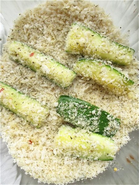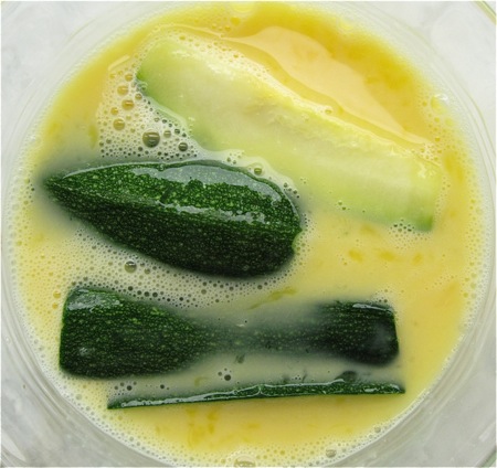 Beat 2 large eggs; or pour 1/2 cup (113g) egg substitute into a dish. You're going to dip each zucchini stick in the egg...