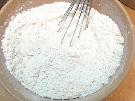 Stir into the milk/egg. Don't beat; some lumps are OK.
