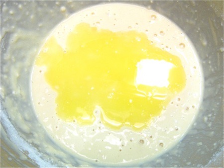 Add 3 tablespoons (43g) melted butter or vegetable oil. Stir it in.