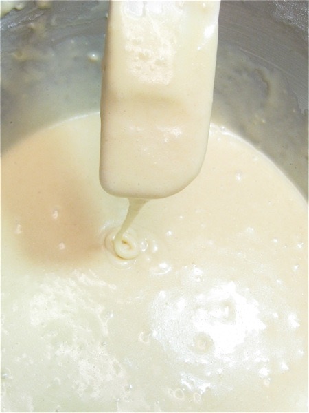 Notice how this batter drips off the spatula in a narrow stream; it's pretty thin. I'm going to let it rest for at least 15 minutes, while my griddle is heating; it'll thicken slightly.