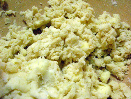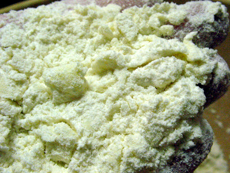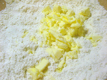 Take another 8 tablespoons (113g) butter and work it into the mixture, leaving butter pieces about the size of raisins, or dried cranberries.