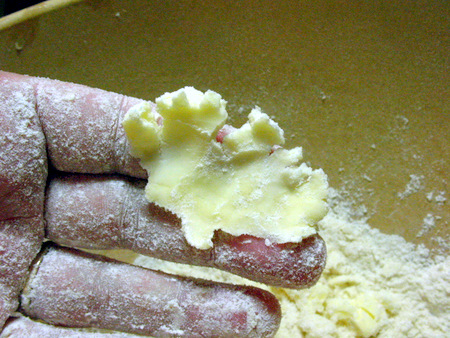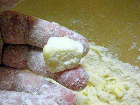 Like this. These leaves of butter will become coated in flour in the dough. As the butter melts and steams away, the coating of flour becomes hollow, making your pastry dough flaky.