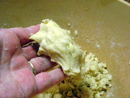 Add the rest of the butter, pulse again, then the ice water. When the dough looks a bit like dry cottage cheese, give it the squeeze test.