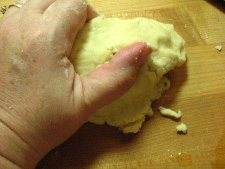 Gently give the dough ball a few kneads until it comes together. Press it out into a disc about 1/2" thick, wrap in plastic wrap, and chill in the fridge for about 30 minutes. Overnight is fine as well.