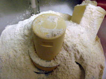 The dough can also be made in a food processor in the blink of an eye. Add the flour and salt and pulse about 10 times. Add the first half of the butter and pulse until you get to the granola stage.