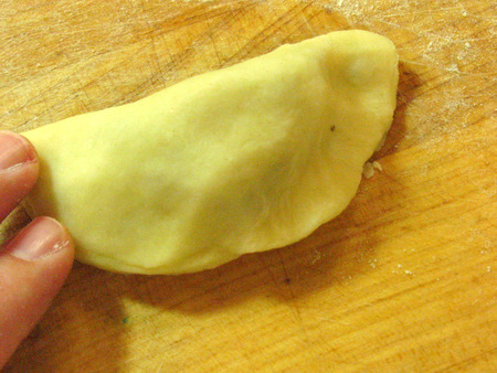 Fold over the dough and pinch the samosa closed with your fingers. For added insurance you can use the tines of a fork to seal the edges as well. Again, brush with egg wash, if desired; it'll give the samosas a shiny/golden crust.