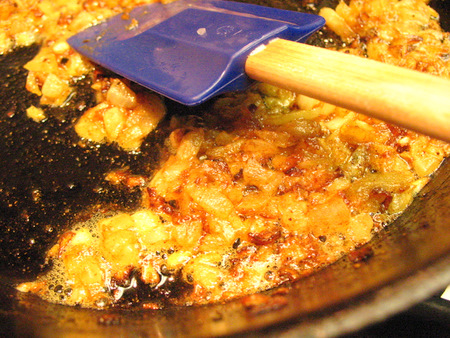 Melt 2 tablespoons (28g) butter in a medium-sized sauté pan. Add 1 cup (142g) diced onions and 2 cloves minced garlic, cooking for 2 to 3 minutes until the onions turn translucent. Take care not to burn the garlic. Add 1/4 to 1/2 teaspoon cumin (to taste), and 1 teaspoon curry powder. Cook for 1 more minute.