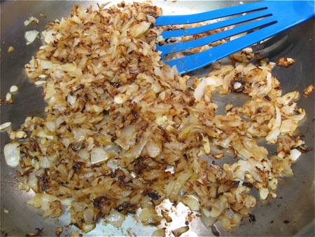 Fry the onions until they're a rich, golden brown in some of the bacon fat, if desired; or fry them in olive oil. They should brown nicely in about 20 minutes.