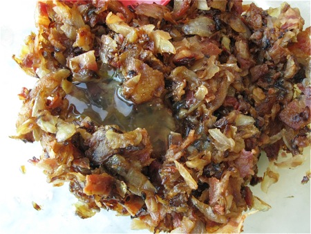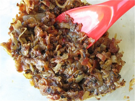 Crumble the bacon, and combine it with the onions. When barely lukewarm, stir in the reserved egg white.